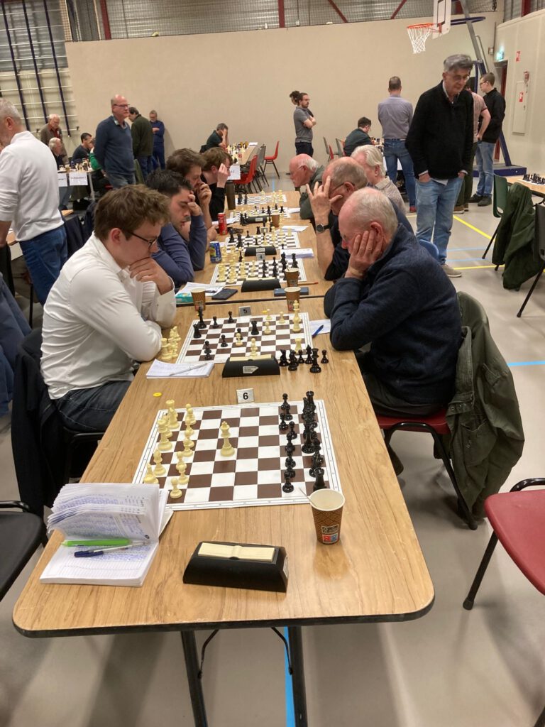 Het Kasteel 2 moest naar Arnhem waar bij ASV ook al een team van Veenendaal ( het vierde) de tegenstander was. Zie de foto hierboven. Het werd een nipte 3.5- 2.5 nederlaag, waardoor de derde plaats in de eindstand werd behaald. Veenendaal 4 werd daarmee kampioen. Zie de uitslagen en eindstand op https://sosc.netstand.nl/rounds/view/3257