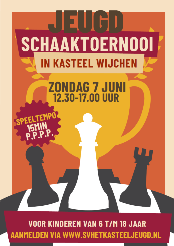 In het kasteel in Wijchen is op de bovengenoemde datum een schaaktoernooi voor de jeugd. Dit toernooi maakt onderdeel uit van het Grand Prix Circuit van de Oostelijke schaakbond. We willen een spannend en leuk toernooi aanbieden voor iedereen onder de 18. We nodigen nadrukkelijk alle kinderen uit die het leuk vinden om te schaken, je hoeft dus niet per se lid te zijn van een vereniging of een rating te hebben. Er zijn maximaal 64 stoelen, dus wees er snel bij!
